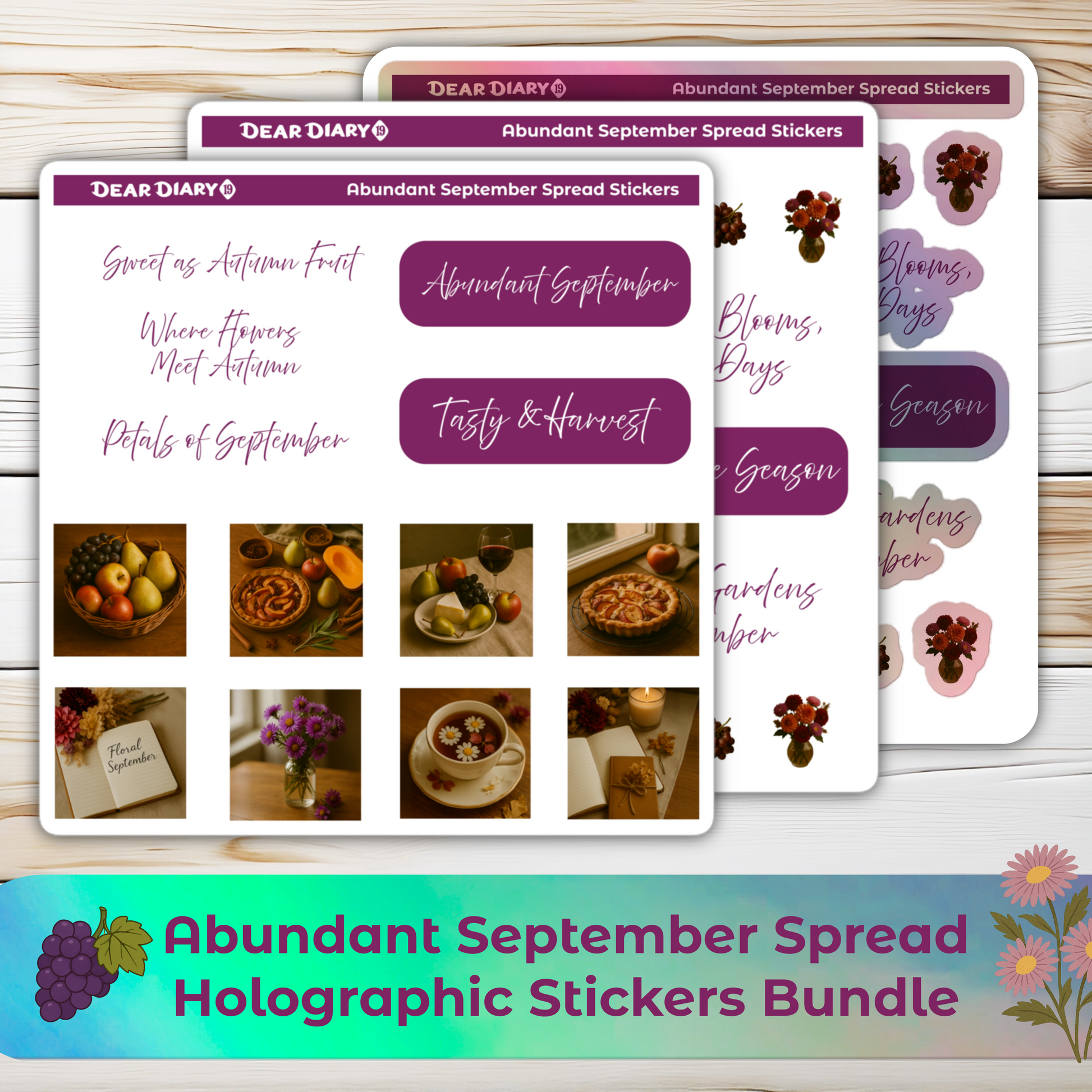 Abundant September spread stickers sheets bundle. Planner journal fall autumn diary calendar timetable vinyl holographic bujo decals. Cute bullet journal or scrapbooking functional die-cut decoration stickers for your checklist weekly monthly hourly daily life plans.