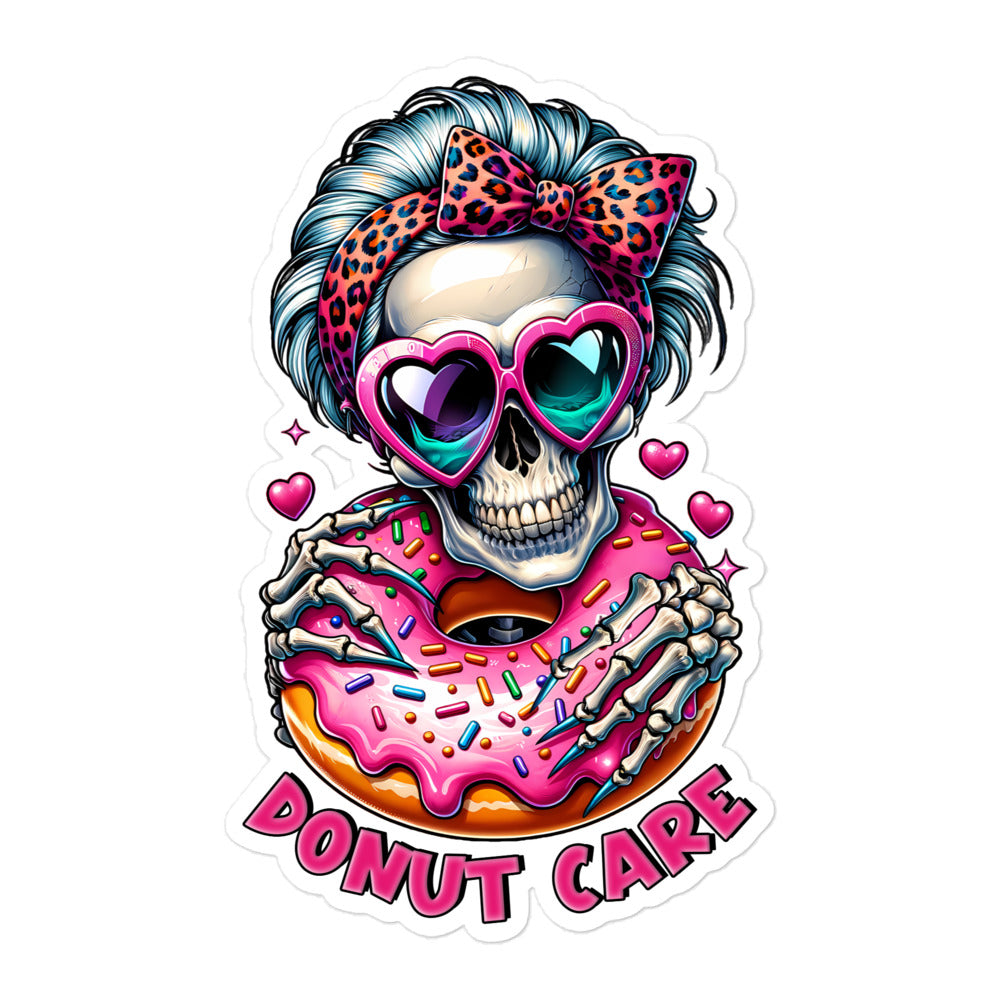 Donut care skull sticker. Funny Skeleton sarcastic self care mental health Halloween vinyl decal. Nice gift favor souvenir.