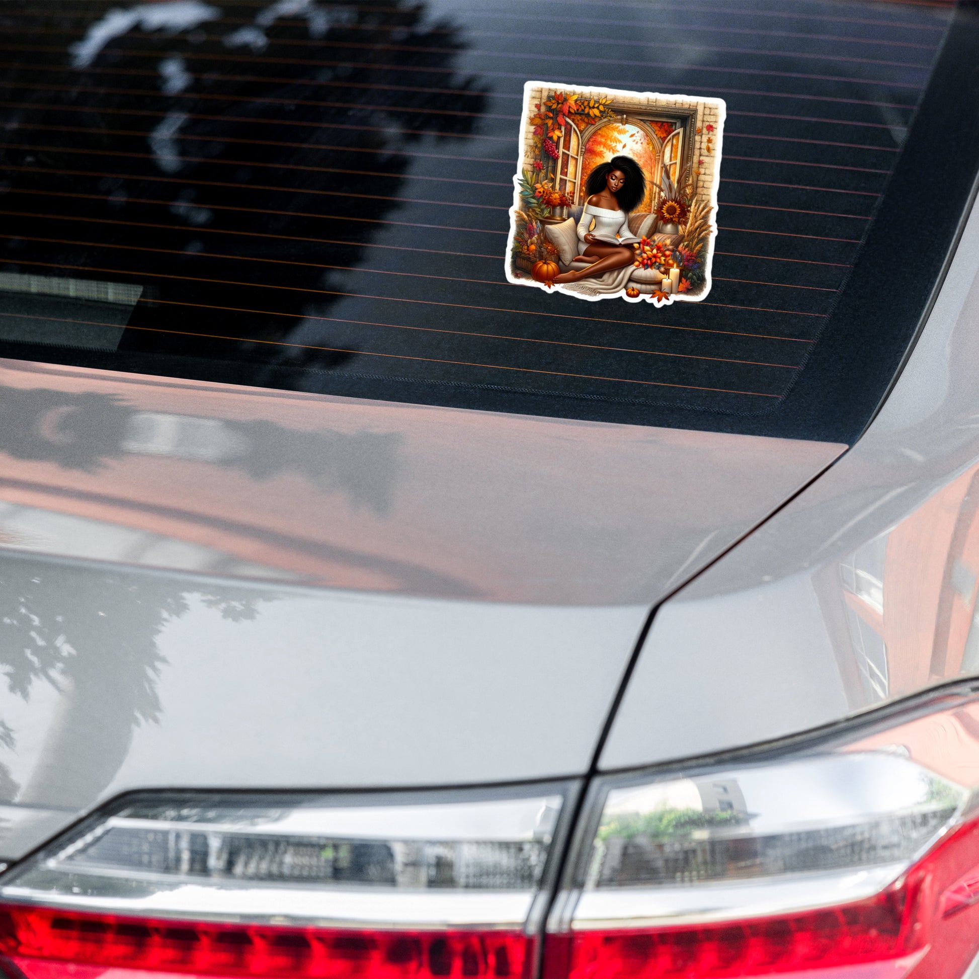 Fall autumn reading girl spread melanin lady sticker. Pumpkin october yellow leaves planner journal decor calendar timetable vinyl holographic bujo decals. Cute bullet journal or scrapbooking functional die-cut decoration stickers for your checklist weekly monthly hourly daily life plans.