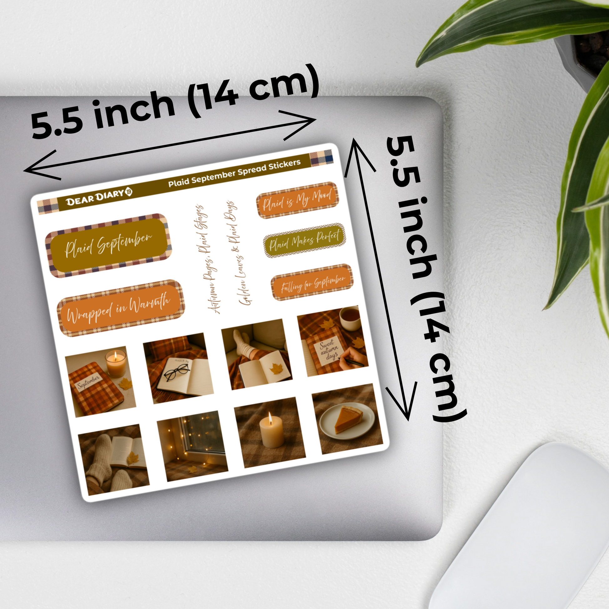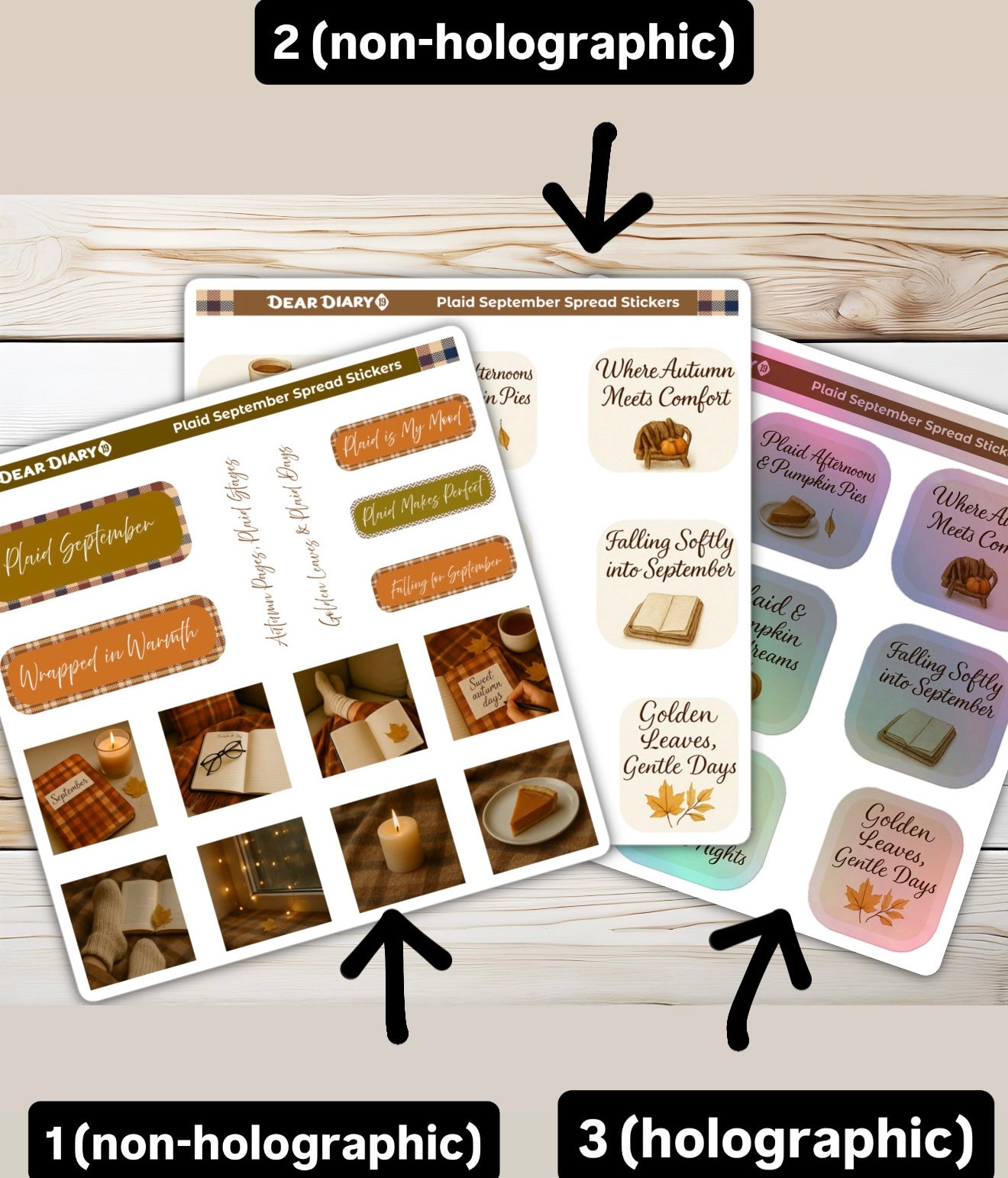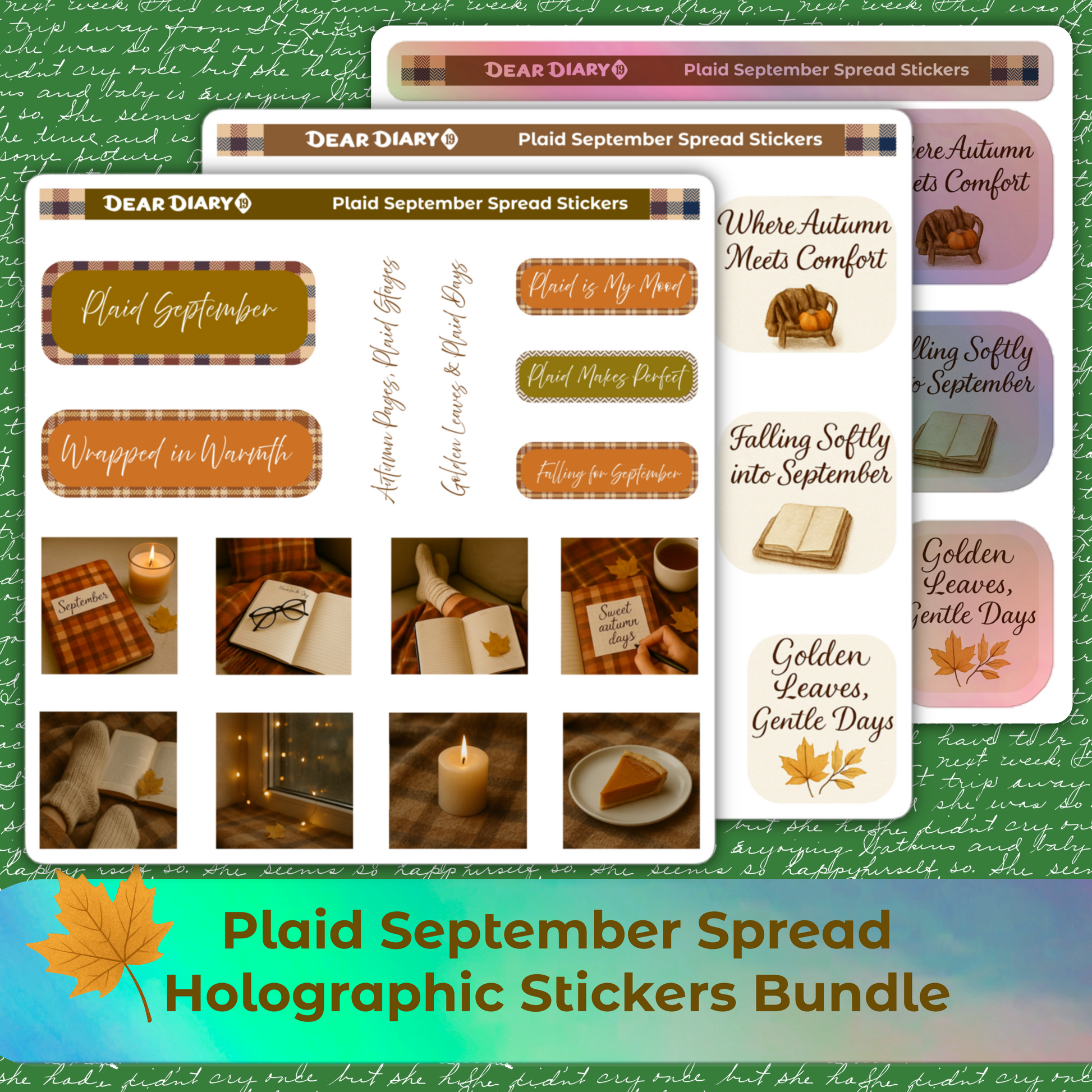 Plaid September spread stickers sheets bundle. Planner journal fall autumn diary calendar timetable vinyl holographic bujo decals. Cute bullet journal or scrapbooking functional die-cut decoration stickers for your checklist weekly monthly hourly daily life plans.