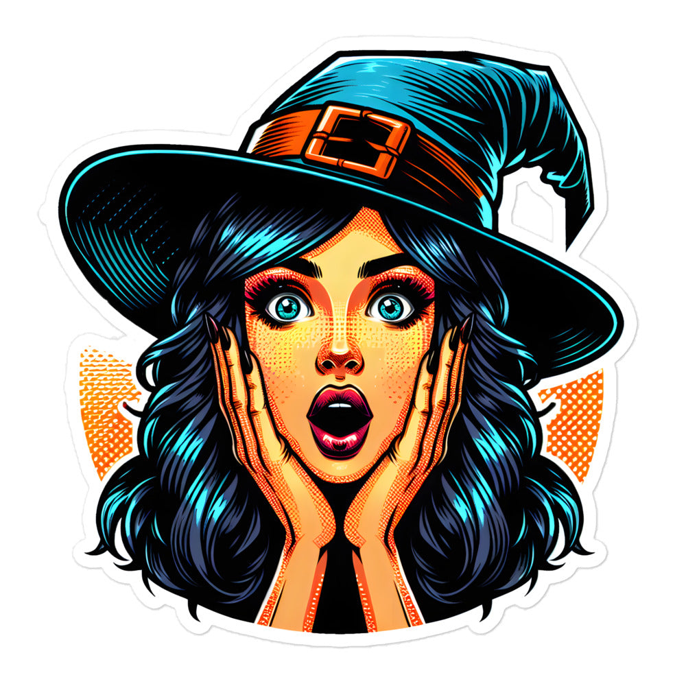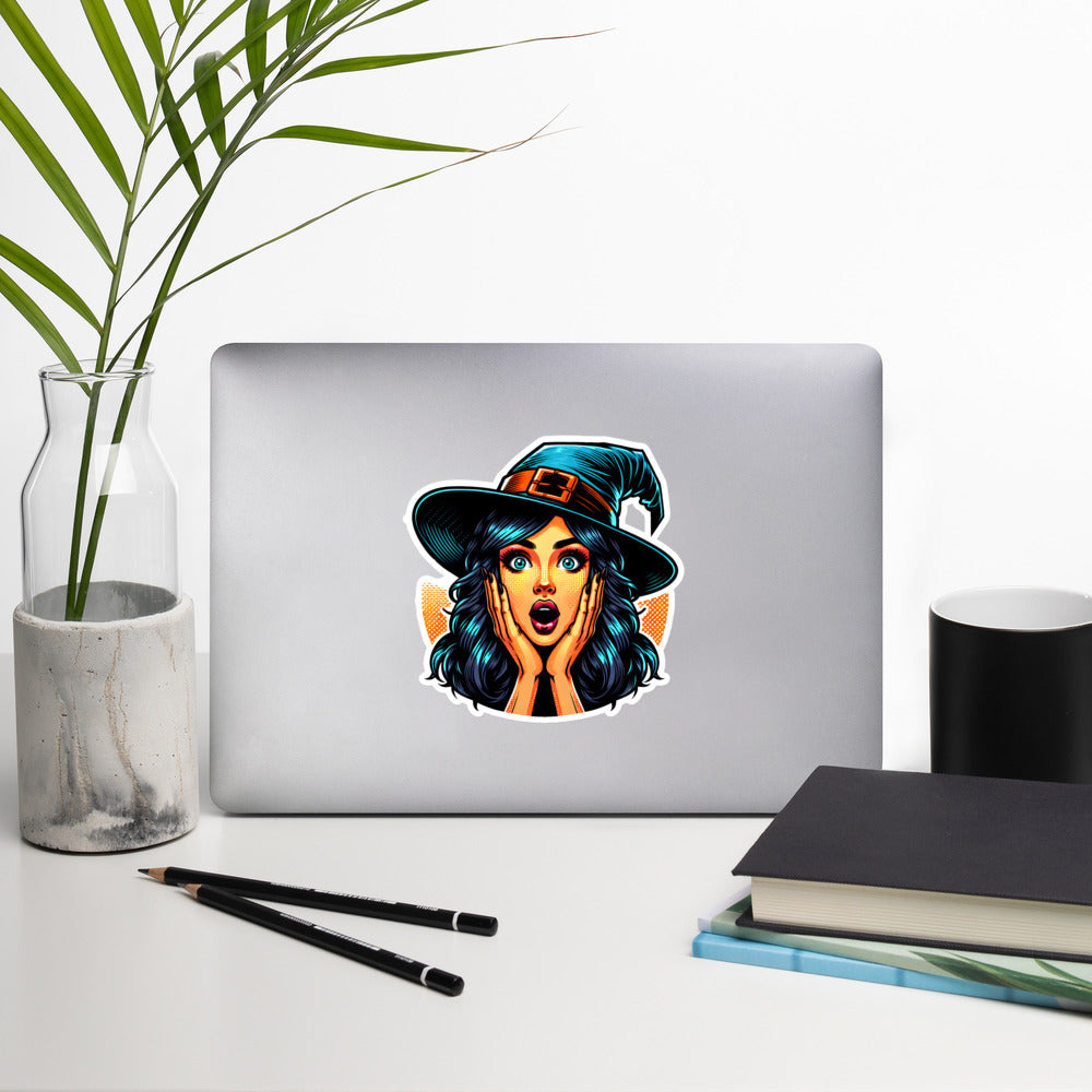 Pop Art Witch sticker. Funny Halloween girl wizard aesthetic vinyl decal. Nice gift favor souvenir.